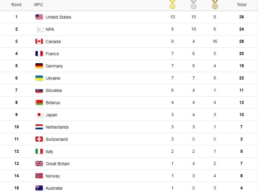 ТОП-15 медального заліку XII зимових Паралімпійських ігор-2018: