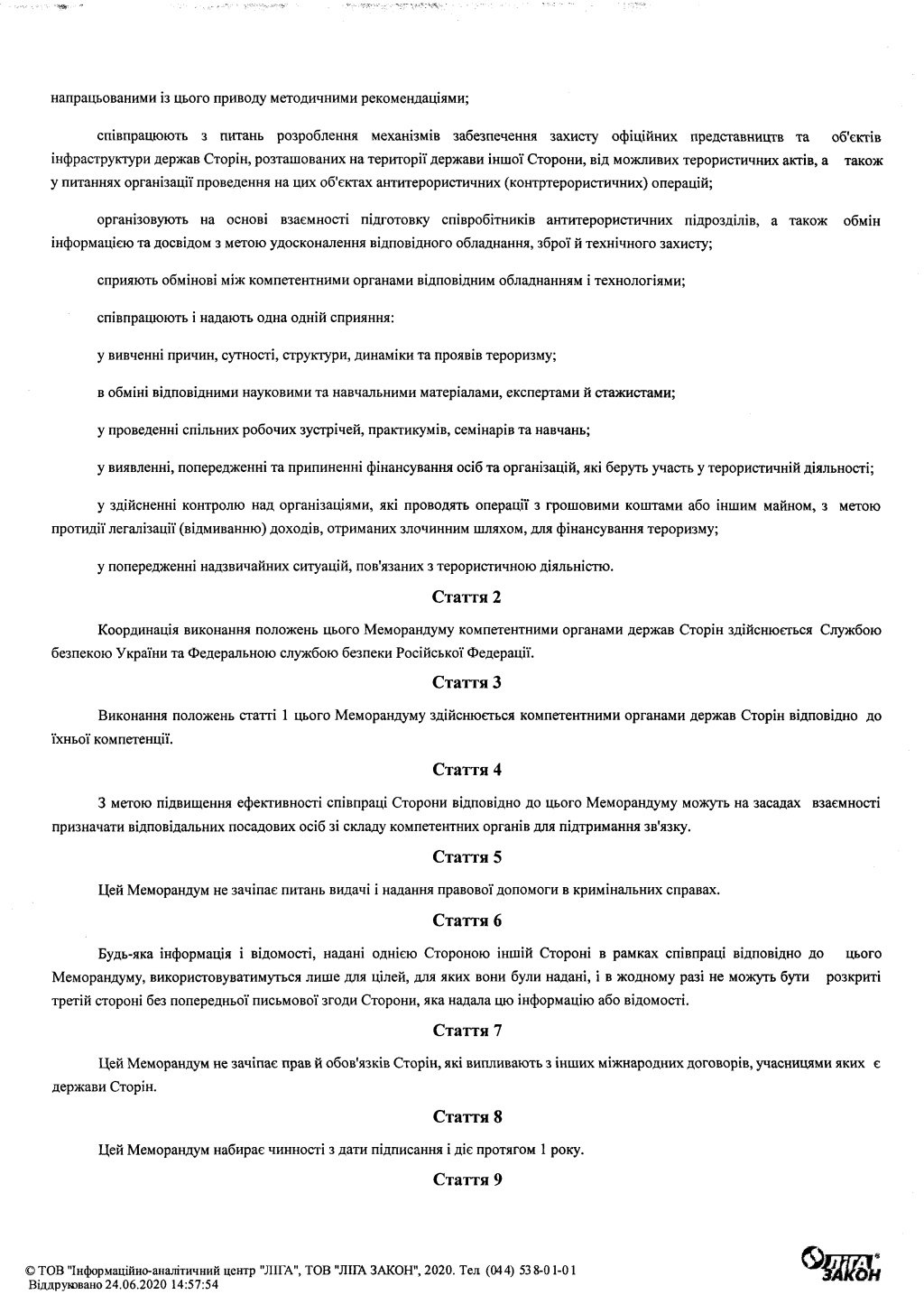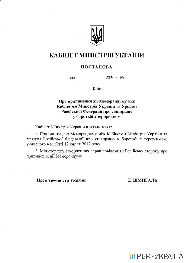 Кабінет Міністрів прийняв рішення про припинення дії меморандуму з урядом Російської Федерації про співпрацю у боротьбі з тероризмом. Меморандум розірвали 8 липня 2020 року.