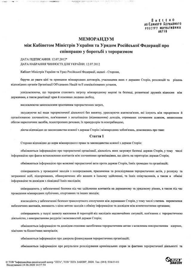 Україна розірвала меморандум з Росією про боротьбу з тероризмом