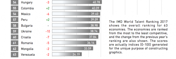 У загальному заліку конкурентності країн по талантах наша країна посіла 59 місце в рейтингу з 63 країн, при цьому за рік позиції України тільки погіршилися.