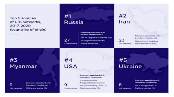 Facebook заявляє, що з 2017 року він виявив кампанії з дезінформації в більш ніж 50 країнах. Звіт підсумовує 150 операцій з дезінформації. В цілому, згідно з аналізом, Росія була найбільшим постачальником дезінформації: за чотири роки там виявили 27 операцій з впливу. З них 15 були пов’язані з розташованим в Санкт-Петербурзі Агентством інтернет-досліджень (ІRА) або іншими організаціями, пов’язаними з Євгеном Пригожиним, російським олігархом, що тісно пов’язаний з президентом Росії Володимиром Путіним. Ще чотири російські мережі були пов’язані з кремлівськими спецслужбами, а ще дві – з сайтами російських ЗМІ.
