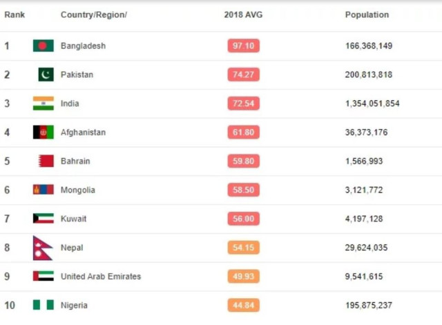 У топ-10 також потрапили Афганістан, Бахрейн, Монголія, Кувейт, Непал, ОАЕ і Нігерія.