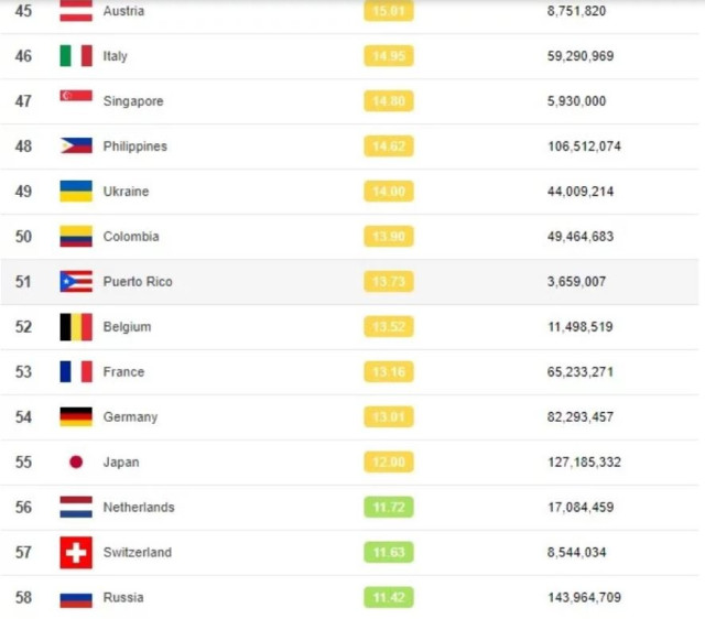 Україна у рейтингу посіла 49 місце із 73 країн світу