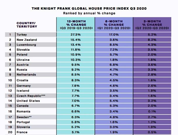 Україна увійшла в топ-10 країн світу за темпами зростання цін на нерухомість. Після того, як в країні ціни на житлову нерухомість зросли на 10,3% в річному численні за підсумками третього кварталу 2020 року, країна опинилася на шостому місці рейтингу, згідно з даними британської компанії Knight Frank Group.