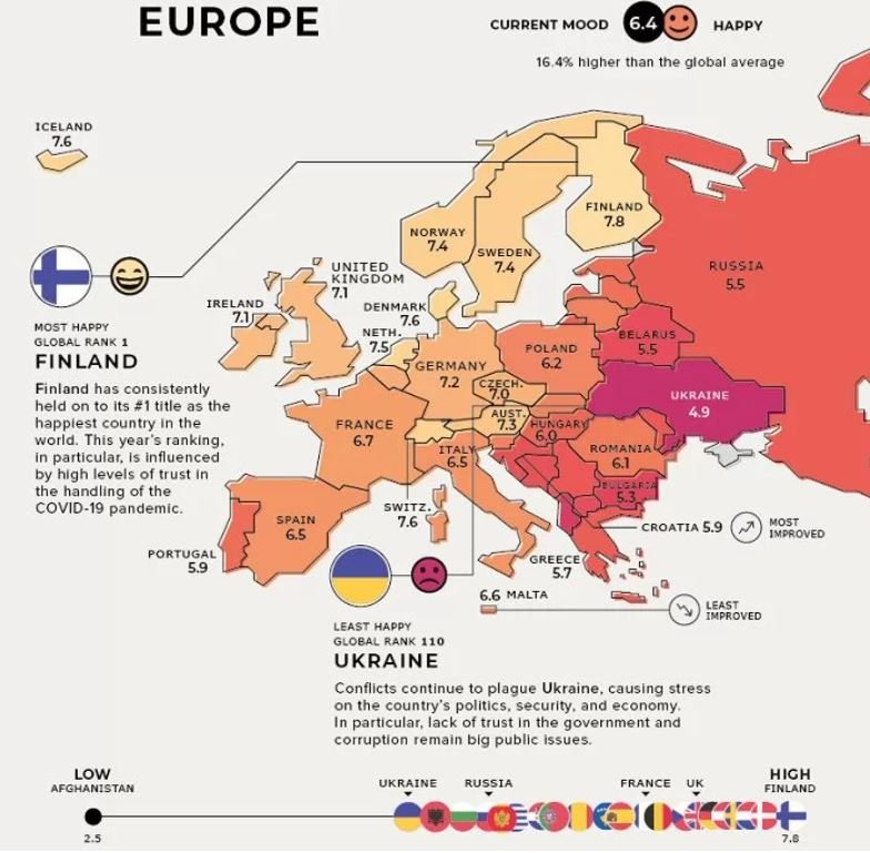 В рейтингу Global Happiness Levels in 2021 Україна отримала 4,9 балів з 8 максимальних. Серед країн європейського континенту це найнижча оцінка щастя населення.