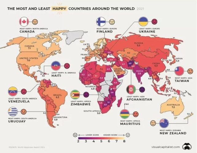 У загальносвітовому рейтингу найщасливіших і найнещасніших країн взяли участь 148 держав. Фінляндія посідає перше місце з найвищим рівнем щастя, а Афганістан - останню позицію рейтингу.Загальносвітовий рейтинг щастя
