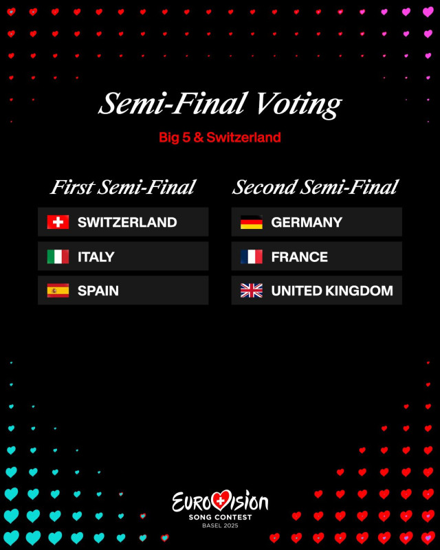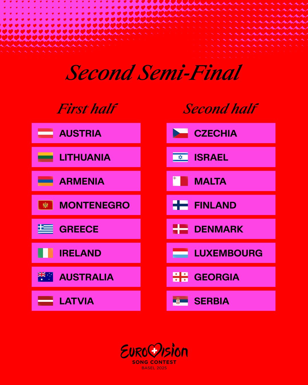 Читати ще: Українці обрали суддів Нацвідбору на «Євробачення-2025»У другому півфіналі 15 травня змагатимуться Австрія, Литва, Арменія, Чорногорія, Греція, Ірландія, Австралія, Латвія, Чехія, Ізраїль, Мальта, Фінляндія, Данія, Люксембург, Грузія та Сербія.Гранд-фінал «Євробачення» у цьому році проведуть у суботу, 17 травня.Як повідомлялося, цього року Євробачення пройде з 13 по 17 травня у швейцарському місті Базель.