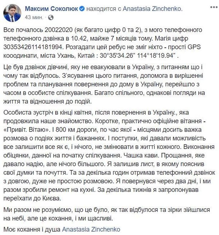 У соцмережі 43-річний голова міграційної служби Максим Соколюк опублікував зворушливий допис, яким оголосив про роман з Анастасією Зінченко. На публічне зізнання він наважився у день свого народження, пише 24 канал.