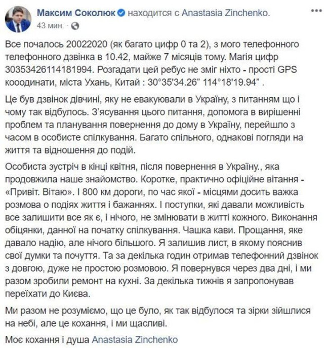 Голова Державної міграційної служби України Максим Соколюк оголосив про роман з Анастасією Зінченко. Дівчина під час спалаху коронавірусу в лютому відмовилась від евакуації з Уханя без свого пса.