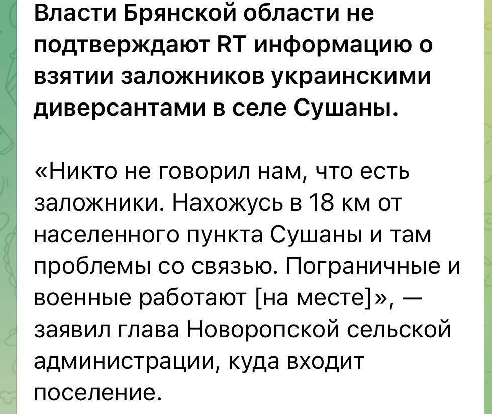«РИА Новости» з посиланням на губернатора Олександра Богомаза пише, що Сушани було атаковано дроном. Тим часом Baza заявляє, що в Сушанах «йде бій, чути вибухи». Також Baza інформує, що нібито було підірвано електропідстанцію і газову станцію в цьому населеному пункті.Кілька росЗМІ пишуть, що нібито взято в заручники кількох людей (Baza повідомляє про двох дорослих і двох дітей в Сушанах, ТАСС – про шість заручників без уточнення населеного пункту). Заручників у Лубечанах, згідно з повідомленнями пропагандистів, утримували в сільському магазині. Однак цю інформацію не підтверджує і місцева влада. Прессекретарка губернатора області заявила виданню «Звезда», що інформації про заручників немає.