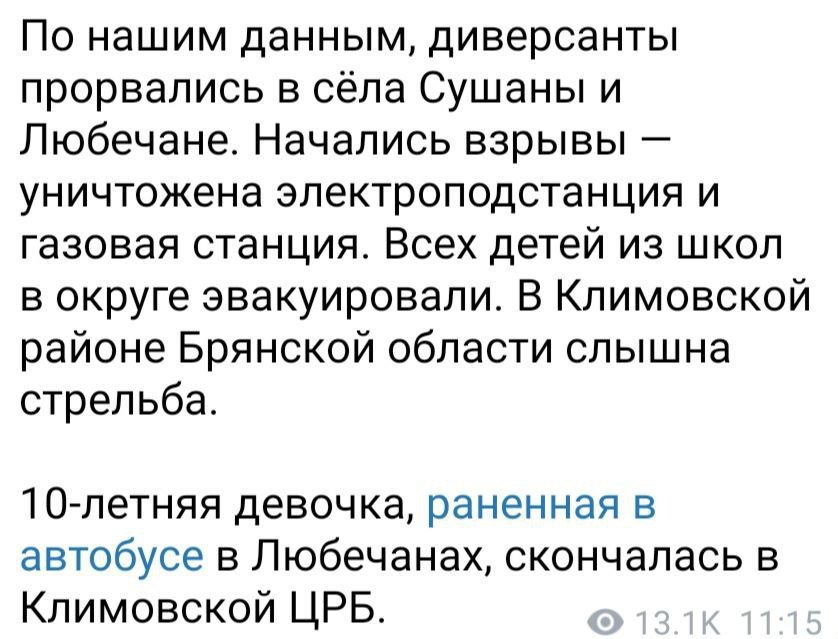 Напередодні російські ЗМІ та пабліки почали писати, що українські диверсанти нібито вступили в бій з російськими військовими у селі Сушани, а одна із груп «захопила заручників» у селі Любечани. Усе це відбувається на території Брянської області.Губернатор Брянської області теж підтвердив, що у прикордонне село Любечани нібито зайшла українська диверсійна група й обстріляла автомобіль. За його словами, одна людина загинула, поранено дитину. Також він заявив про обстріл сіл Сушани та Ломаковка.