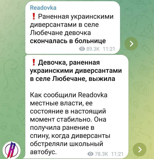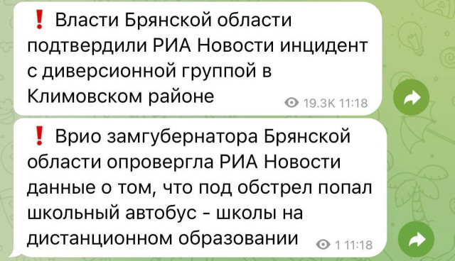 Так, влада не підтвердила повідомлення про «обстріл шкільного автобуса», адже діти навчаються дистанційно.Readovka заявляла, що в Любечанах «диверсанти» поранили дівчинку і вона померла. Вже через кілька хвилин дитина «воскресла». Згодом заступник губернатора Брянської області Андрій Бардуков заявив виданню «Звезда», що поранено не дівчинку, а хлопчика, і життю дитини нічого не загрожує.Представник Одеської ОВА Сергій Братчук, коментуючи повідомлення росіян про «диверсію», зазначив, що якщо хоч частина опублікованої інформації відповідає дійсності, то стоять за цим, ймовірно, вагнерівці-втікачі, а не «українська ДРГ».