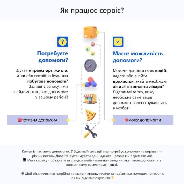 Кожен із нас може бути корисним. Купити ліки або принести води старшим людям, які залишилися самі в квартирі, – це також допомога», – йдеться у повідомленні.Як це працює: