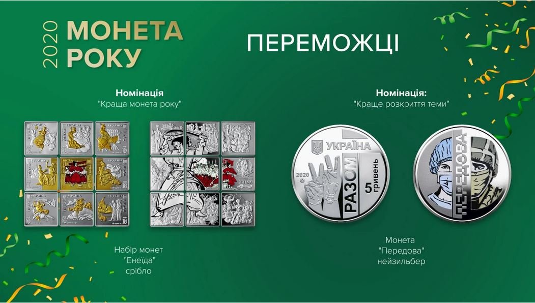 Він зазначив, що з Національного банку України повідомили, що у десятку кращих монет світу, викарбуваних у 2020 році, увійшли українські монети: у номінації «Краща монета, присвячена сучасним подіям» - монета «75 років Перемоги над нацизмом у Другій світовій війні», у номінації «Краща монета стандартного розміру (до 37 мм у діаметрі, крона)» - срібна монета «ХХХІІ Олімпійські ігри», у номінації «Краще художнє рішення» - монета «День пам'яті полеглих захисників», у номінації «Краща інноваційна монета» - набір із дев'яти монет «Енеїда».