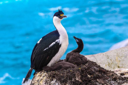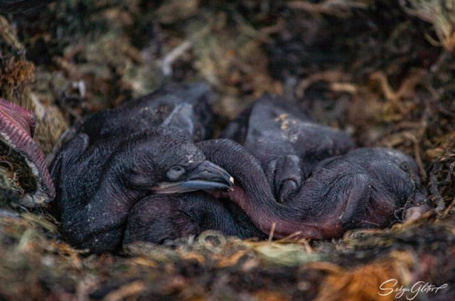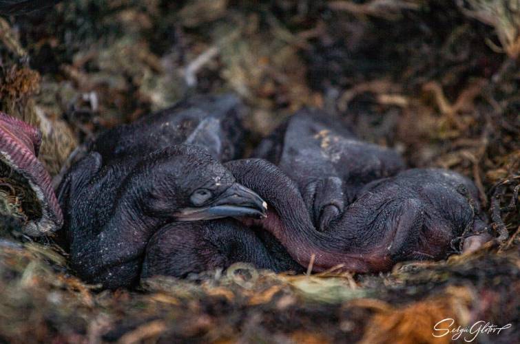 На першій світлині – новонароджені бакланята, вони зовсім дрібненькі та голі, схожі на дитинчат динозаврів. Поступово малята вкриваються коричневим пухом, десь за 2 місяці після народження.Через місяць вони виростають «пухнастиками», що за розмірами часто не відрізняються від батьків, хоча тіло в них менше.Фото зробили українські біологи на одному з сусідніх островів – Пітермані. Там є 2 колонії синьооких бакланів, які українські вчені постійно моніторять.