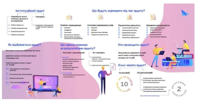 В Україні з’явиться інституційний аудит. В Міністерстві освіти та науки затвердили, що нові наглядово-контрольні функції будуть інструментом підтримки освітніх закладів. Такий аудит проводитимуть не частіше, ніж раз на десять років відповідно до перспективних і річних планів.