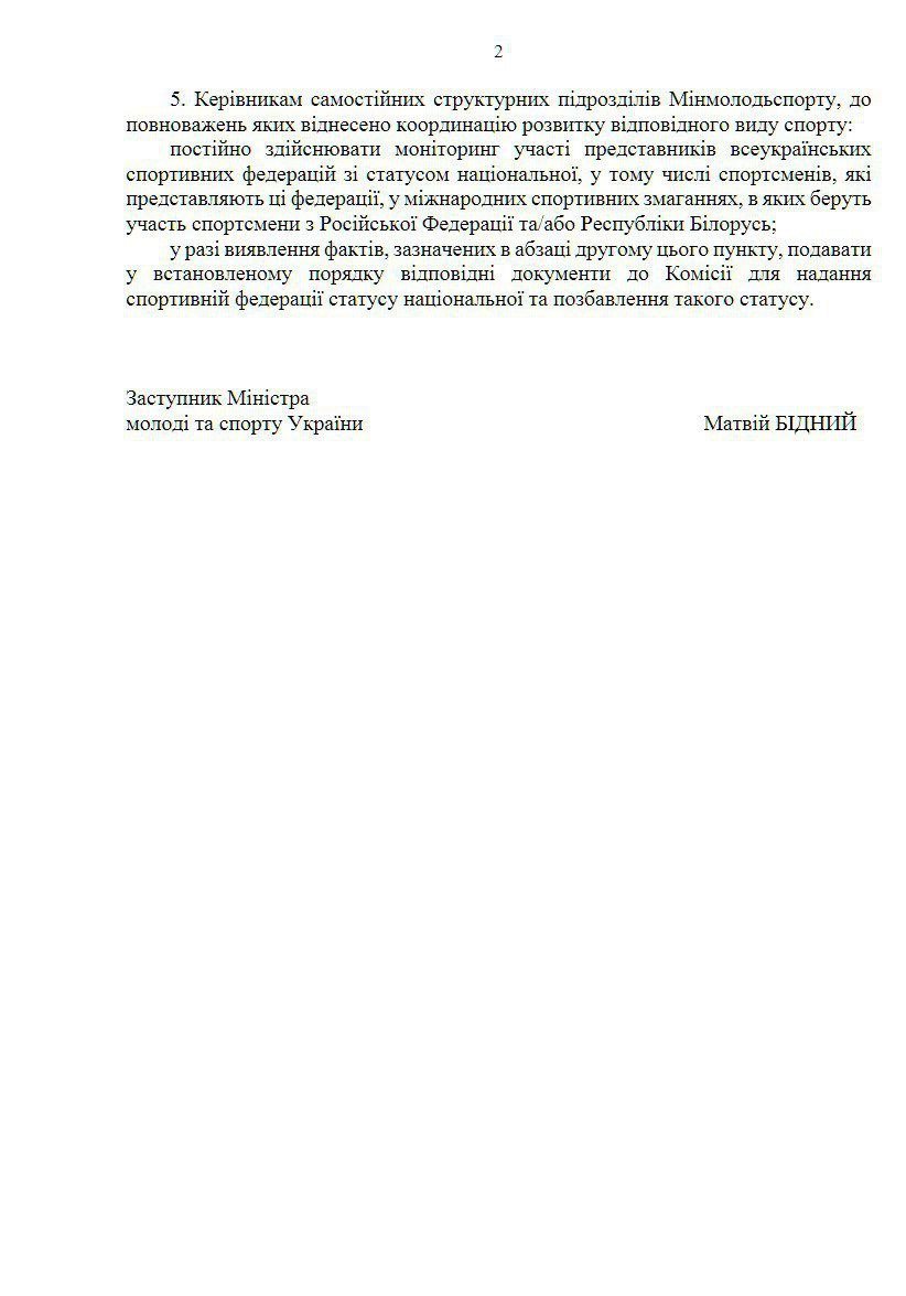А керівникам самостійних структурних підрозділів міністерства тепер необхідно моніторити участь представників всеукраїнських спортивних федерацій зі статусом національної, а також атлетів, що їх представляють, у міжнародних спортивних змаганнях за участю спортсменів з Росії та Білорусі.