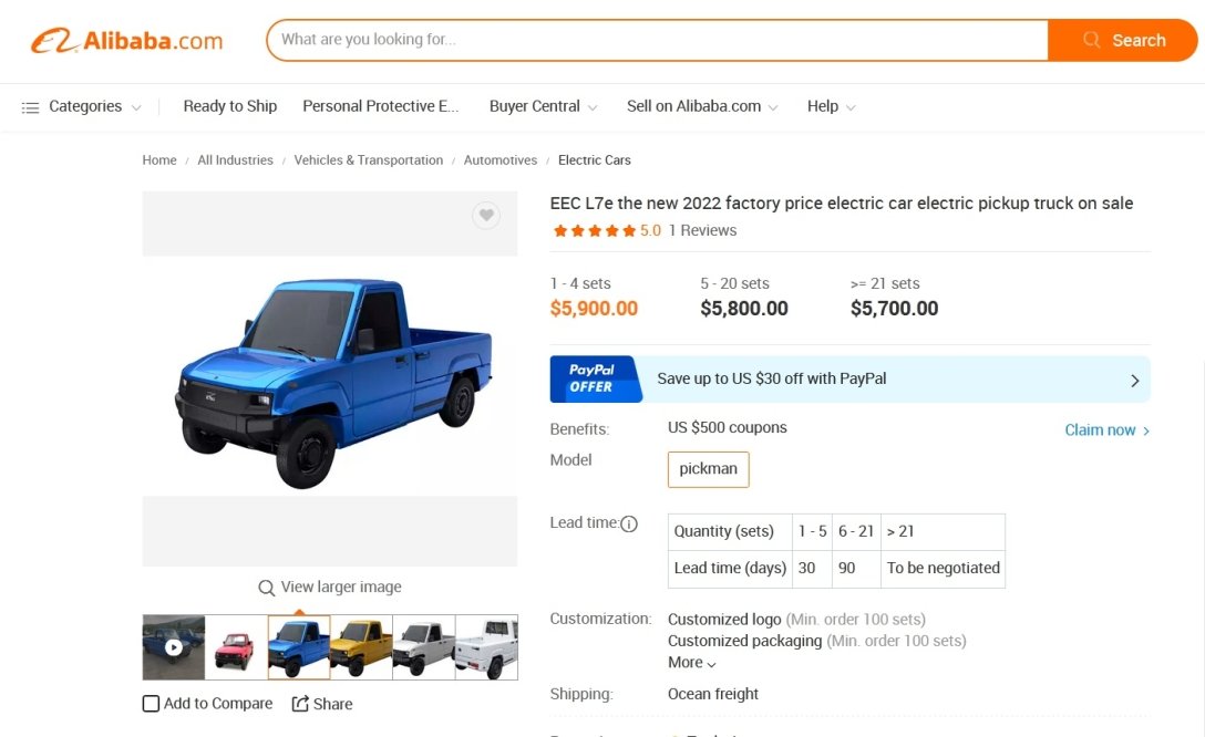 Китайський електромобіль знайшли на сайті Alibaba. Він називається EEC L7e і продається за ціною від $5900 у роздріб та $5700-5800 – при купівлі партії авто оптом.