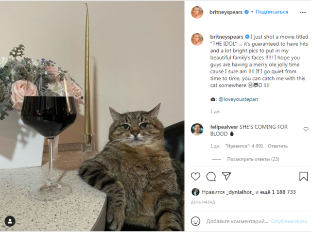 «Якщо від мене час від часу не буде нічого чутно, зможете мене десь зловити із цим котом!» – так підписала Брітні публікацію, присвячену зніманням фільму The Idol.Вона – не перша зірка, що звернула увагу на Степана. Раніше, наприклад, схожу публікацію зробила у себе в інстаграмі акторка та модель Діана Крюгер. Крім того, харківського кота розмістив на своїй сторінці і популярний англомовний паблік brokencattos, де його вподобали 44 тисячі разів.