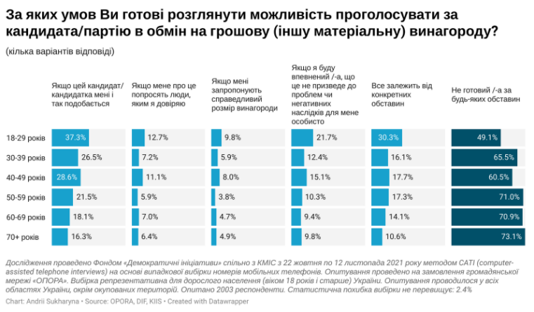 При цьому молодші виборці частіше виявляли готовність «продати» голос. Лише 50% виборців до 30 років сказали, що в жодному випадку не готові «продати» голос. Водночас серед старших респондентів таких 60-70%.Абсолютна більшість респондентів на запитання, чому виборці погоджуються отримати гроші чи іншу матеріальну винагороду від кандидата/партії в обмін на підтримку на виборах, відповіли, що причина в тому, що люди бідні, а це додаткова можливість підзаробити – 82,5%. Ще 65% вважають, що людям усе одно за кого голосувати, якщо їм пропонують гроші. Також більше половини (56%), вказали на те, що люди беруть гроші, але голосують самостійно. Ще 37% вказали, що люди не хочуть відмовляти у проханні друзям, знайомим, родичам, сусідам, керівництву, колегам.