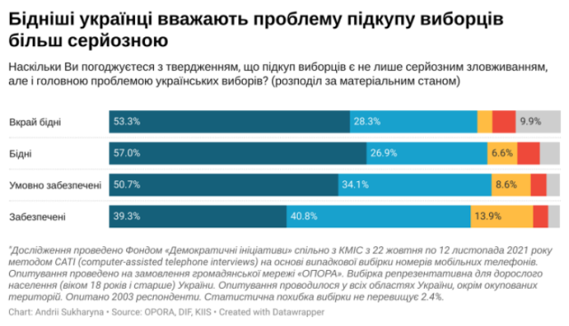 «Абсолютна більшість опитаних вважають, що технології підкупу виборців впливають на результати виборів. Так, 33% вважають, що такий вплив є дуже великим, а ще майже 50% – що такий вплив скоріше є. Лише 3,5% вважають, що технології підкупу виборців взагалі не впливають на результати виборів», – йдеться у результатах опитування.