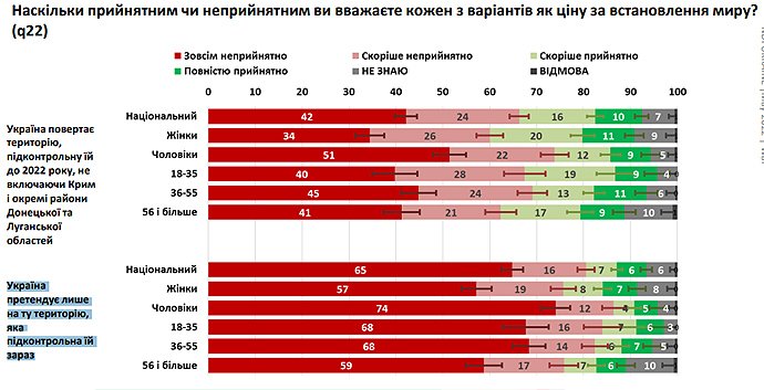 Варіант досягнення миру, за якого Україна претендує лише на ту територію, яка підконтрольна їй зараз, неприйнятний для 81% українців.Загальнонаціональне дослідження було розроблене та проведене Національним демократичним інститутом в Україні. Польові роботи виконав Київський міжнародний інститут соціології з 2 по 11 травня. Методом телефонних інтерв’ю опитали 2 500 осіб, які проживають в Україні та користуються мобільними телефонами. Території, які були непідконтрольні уряду України до 24 лютого виключені з дослідження.