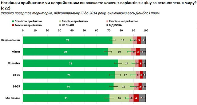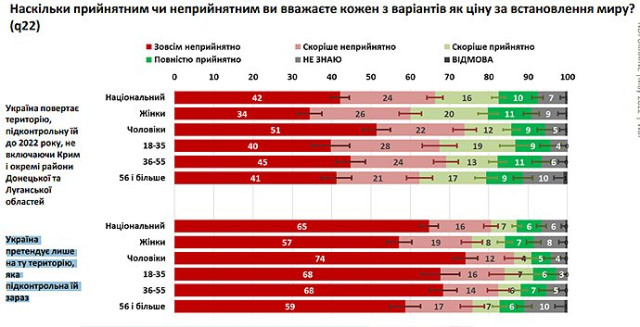 «Українці демонстративно не зацікавлені віддавати землю за мир. Єдиним прийнятним сценарієм припинення війни для українців є повернення Україною території, яку вона контролювала до 2014 року, що включає весь Донбас і Крим (89%)», – йдеться у повідомленні.Так, 66% опитаних заявили, що вважають неприйнятним варіант, коли Україна повертає територію, підконтрольну їй до 2022 року, не включаючи Крим і окремі райони Донецької та Луганської областей.
