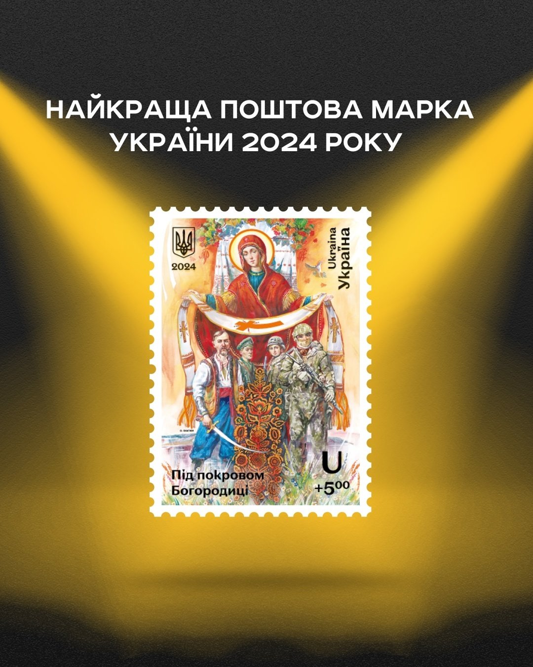 Перемогу в номінації «Найкраща поштова марка України 2024 року» здобула мініатюра «Під покровом Богородиці». Ця благодійна марка, представлена Укрпоштою 1 жовтня 2024 року до Дня захисників і захисниць України, стала символом глибокого зв’язку між українськими воїнами та їхньою небесною заступницею – Дівою Марією.