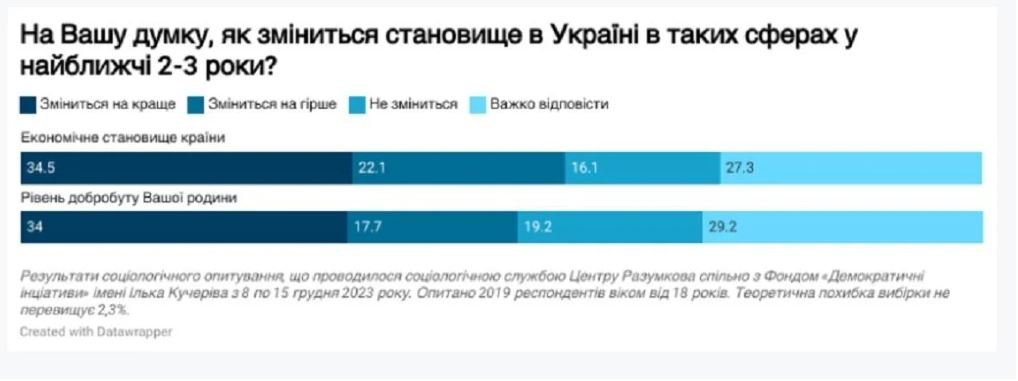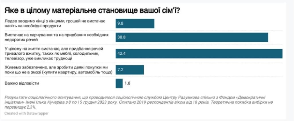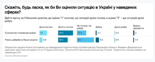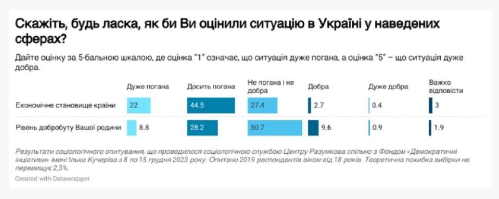 «Але, за даними опитування, що було проведене у грудні 2023 року, ці оцінки погіршилися (відповідно 66,5%, 3% і 27%), і зараз на статистично значущому рівні не відрізняються від тих, які спостерігалися у вересні-жовтні 2022 року», – свідчать дані опитування.Також зауважується, що рівень добробуту власної родини, здебільшого, громадянами оцінюється краще, ніж економічна ситуація в країні. За даними опитування, проведеного у лютому-березні 2023 року оцінка добробуту родини покращувалась. Однак з того часу оцінки дещо погіршилися: «дуже» або «досить» поганий рівень – 37%, «не поганий і не добрий» – 51% і «добрий» або «дуже добрий» – 10,5%.