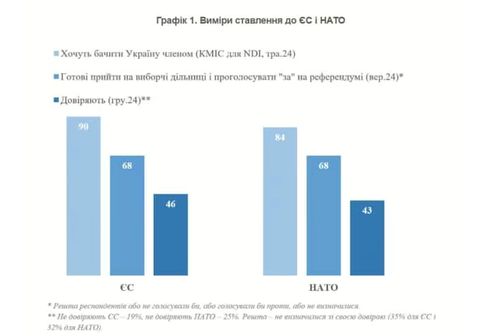 У разі проведення референдуму щодо вступу до ЄС 68% серед усіх українців готові прийти на виборчі дільниці і віддати голос «за». У разі проведення референдуму щодо НАТО – також 68%.