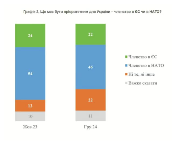 Соціологи також звернули увагу на те, що впродовж останнього року стало більше тих, хто говорить, що не треба мати за пріоритет членство в жодному союзі: 12% у жовтні 2023 року й 22% у грудні 2024-го.Водночас поменшало тих, хто говорить про членство в НАТО: 54% раніше і 46% зараз. Для ЄС показники майже не змінилися: 24% та 22%.
