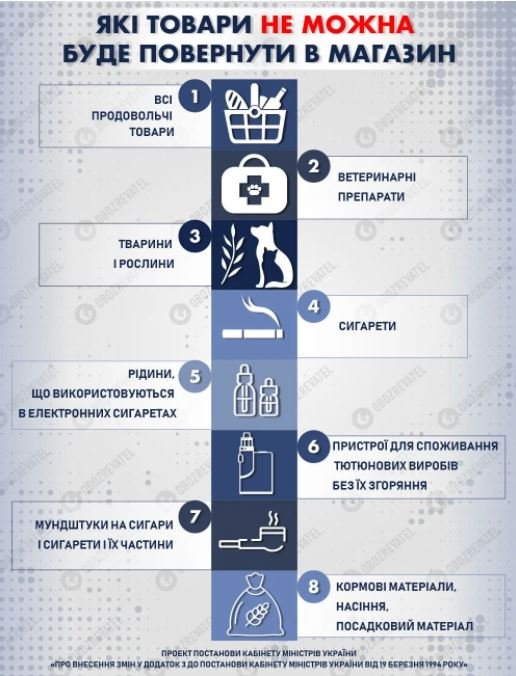 Проєкт постанови з новим переліком «заборонених» товарів опублікували на сторінці Мінекономіки. Як пояснив експерт у сфері захисту прав споживачів Максим Несміянов, чинний закон (а це важливіше постанови уряду) дає можливість повертати в магазин навіть продукти харчування (хоча повернення було і залишається під забороною).