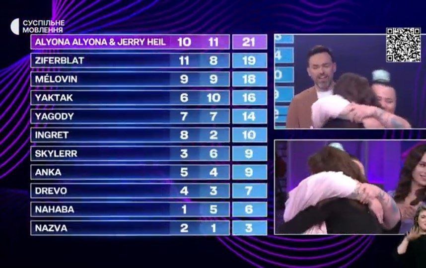 Найбільшу кількість балів від жюрі отримав гурт Ziferblat, від глядачів – Alyona & Alyona та Jerry Heil.До слова, волинянин Ярослав Карпук на псевдо YAKTAK набрав 16 балів, посівши 4 місце. 10 балів він отримав від глядачів, що є другим найвищим результатом.Як повідомлялося, переможця нацвідбору на Євробачення мали оголосити 3 лютого, однак через збій у «Дії» не всі охочі змогли віддати голос за обрану пісню. Тому глядацьке онлайн-голосування продовжили ще на день.