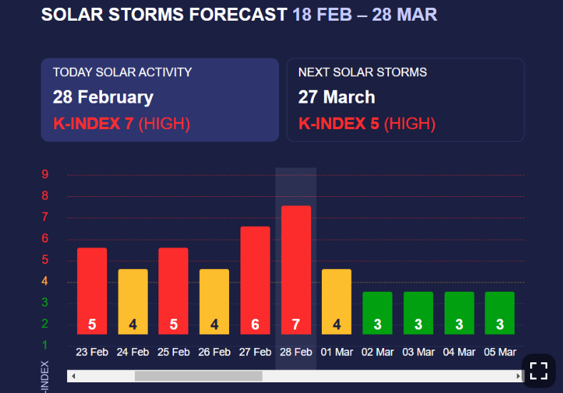 Учора, 27 лютого, також буда підвищена геомагнітна активність – з К-індексом 6. Утім сьогодні вона помітно збільшилася. За попередніми прогнозами, вже 1 березня рівень сонячної активності опуститься до Кр 4.