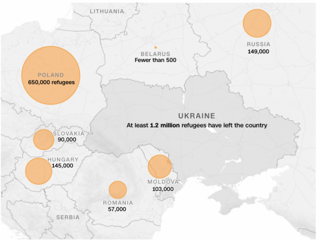 Згідно з даними Управління Верховного комісара ООН у справах біженців, понад 1,2 мільйона біженців покинули Україну з початку російського вторгнення 24 лютого. Такі дані станом на 5 березня 2022 року.