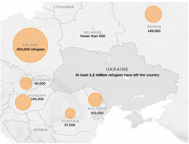 Згідно з даними Управління Верховного комісара ООН у справах біженців, понад 1,2 мільйона біженців покинули Україну з початку російського вторгнення 24 лютого. Такі дані станом на 5 березня 2022 року.