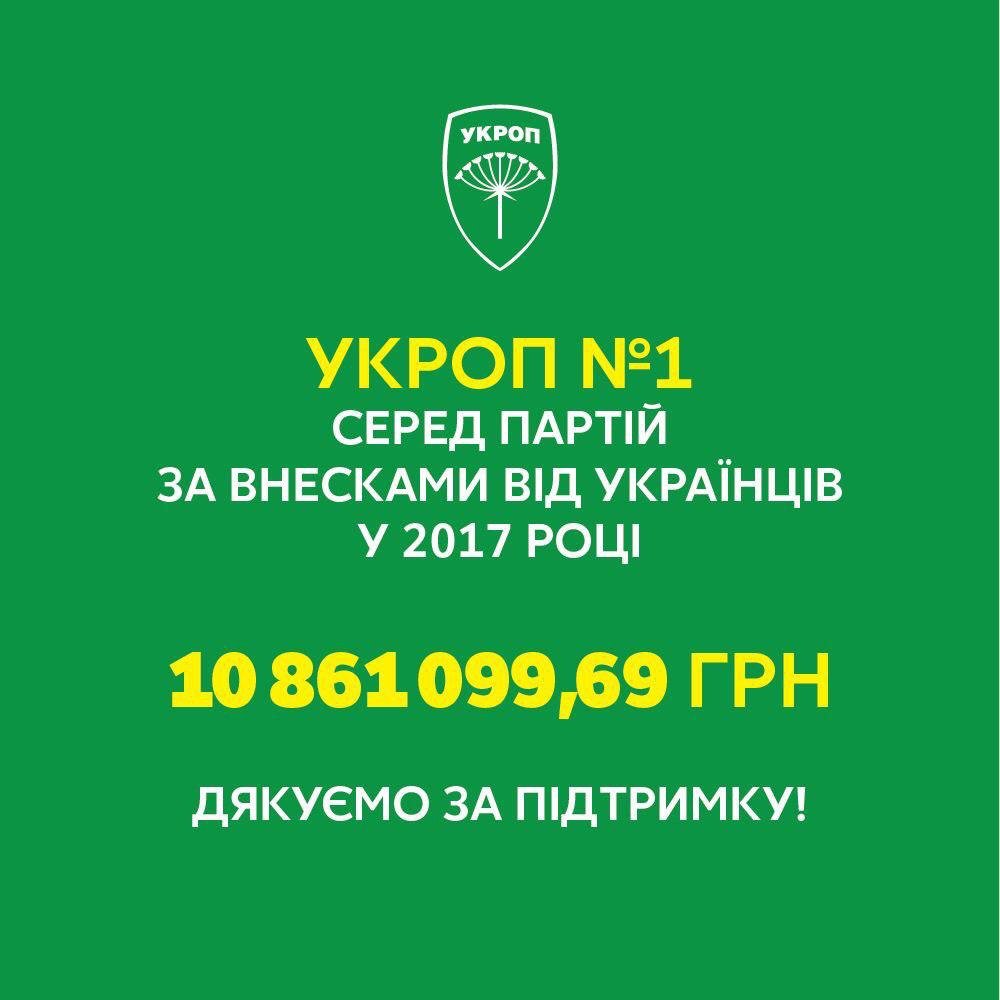Політична партія «Українське об'єднання патріотів — УКРОП посіла перше місце серед усіх політичних сил України за сумою внесків від фізичних осіб у 2017 році.