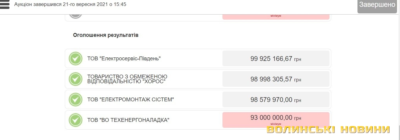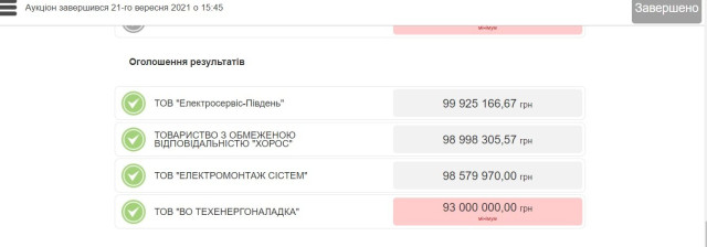 Тендер на 100 мільйонів гривень, оголошений 20 липня, відбувся 21 вересня. На аукціон подали пропозиції три підприємства: ТОВ «ВО Техенергоналадка», ТОВ «Електромонтаж Сістем», ТОВ «Хорос», ТОВ «Електросервіс-Південь».