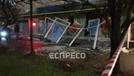 При цьому скляна вітрина вилетіла назовні, а у самому відділенні впала на підлогу стеля.