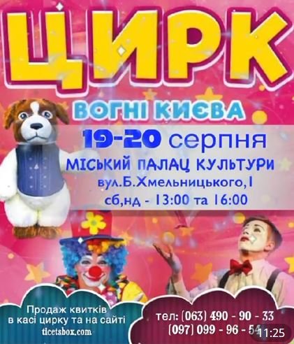 19 та 20 серпня (субота та неділя) о 13:00 та 16:00 на сцені Палацу культури (вул. Б. Хмельницького, 1) відбудуться лише чотири вистави Київського державного цирку «Вогні Києва».
