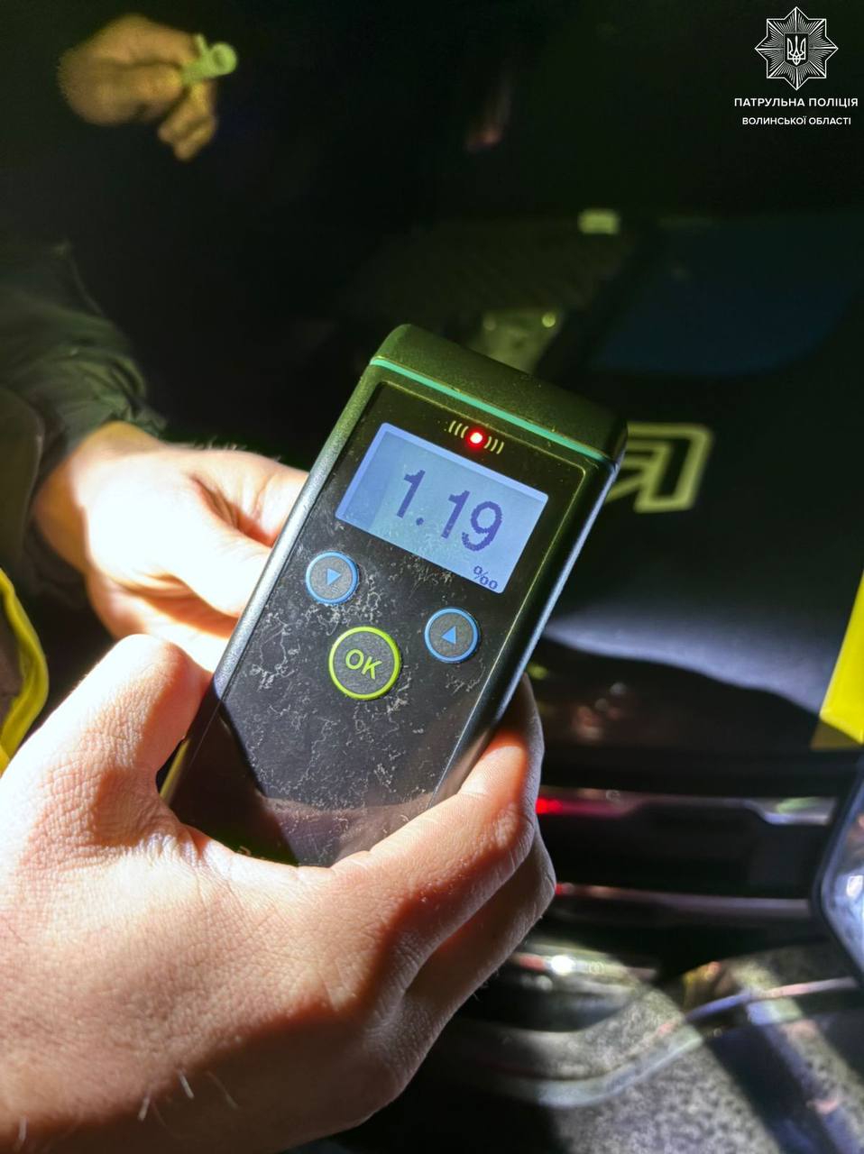 Ба більше, під час спілкування з юнаком інспектори помітили в нього ознаки алкогольного сп’яніння. Громадянин пройшов огляд за допомогою приладу «Драгер». Результат – 1,19 проміле.Читати ще: Уночі в Рованцях п’яний водій на Volkswagen втікав від патрульних, авто перевернулося