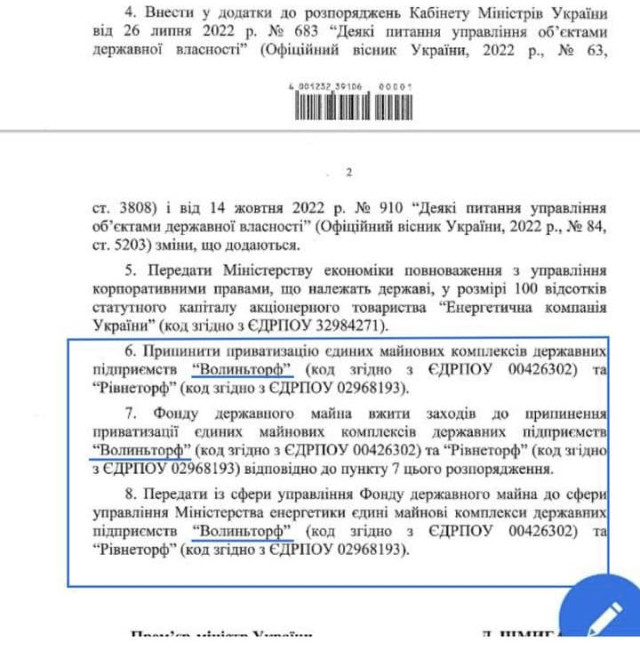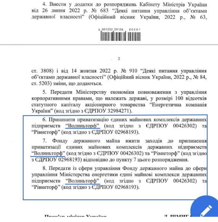Згідно з документом, єдиний майновий комплекс «Волиньторфу» передали зі сфери управління Фонду держмайна до сфери управління Міністерства енергетики України.Раніше Міністерство Енергетики України ініціювало припинення процедури приватизації державного підприємства «Волиньторф».
