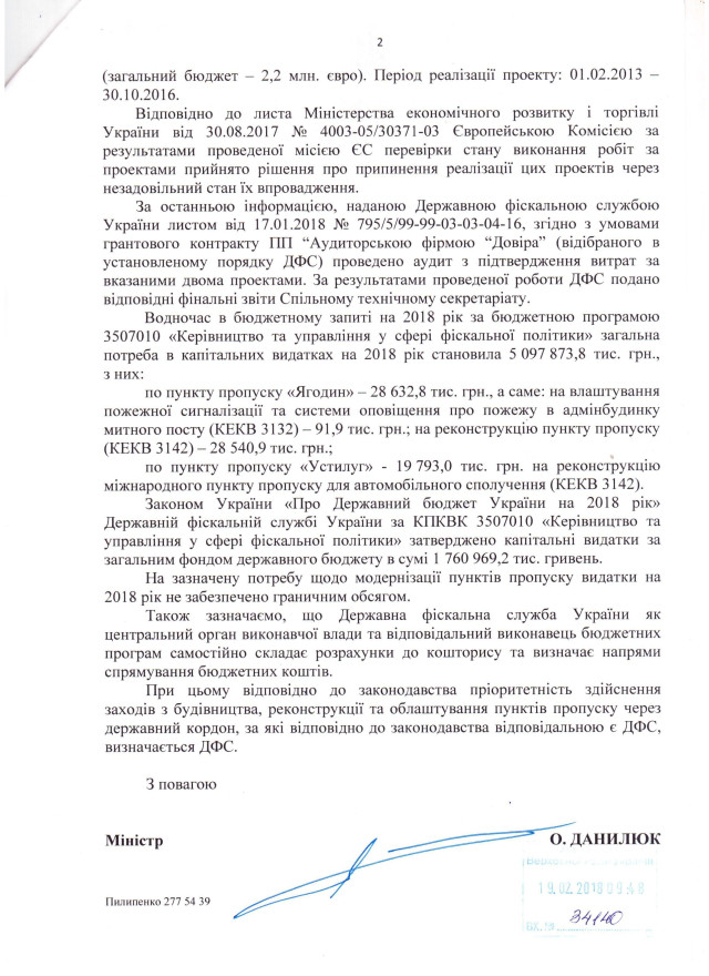 Також у міністерстві зазначають, що на цільову програму «Керівництво та управління у сфері фіскальної політики» у держбюджеті на 2018 рік фактично заклали лише 1,76 мільярда із 5,1 мільярда необхідних. У тому числі гроші не передбачили на модернізацію пунктів пропуску «Ягодин» та «Устилуг».