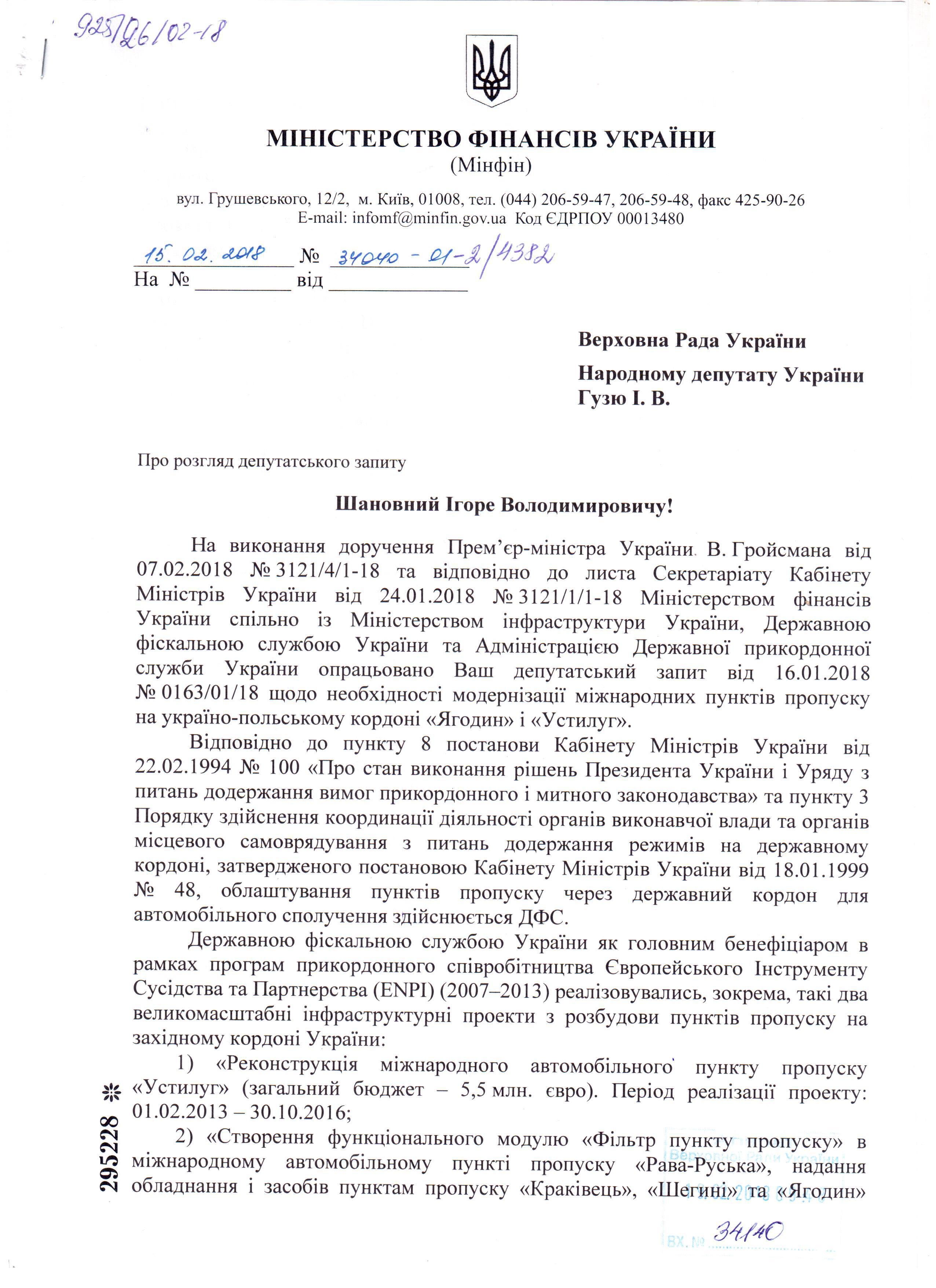 Також у міністерстві зазначають, що на цільову програму «Керівництво та управління у сфері фіскальної політики» у держбюджеті на 2018 рік фактично заклали лише 1,76 мільярда із 5,1 мільярда необхідних. У тому числі гроші не передбачили на модернізацію пунктів пропуску «Ягодин» та «Устилуг».