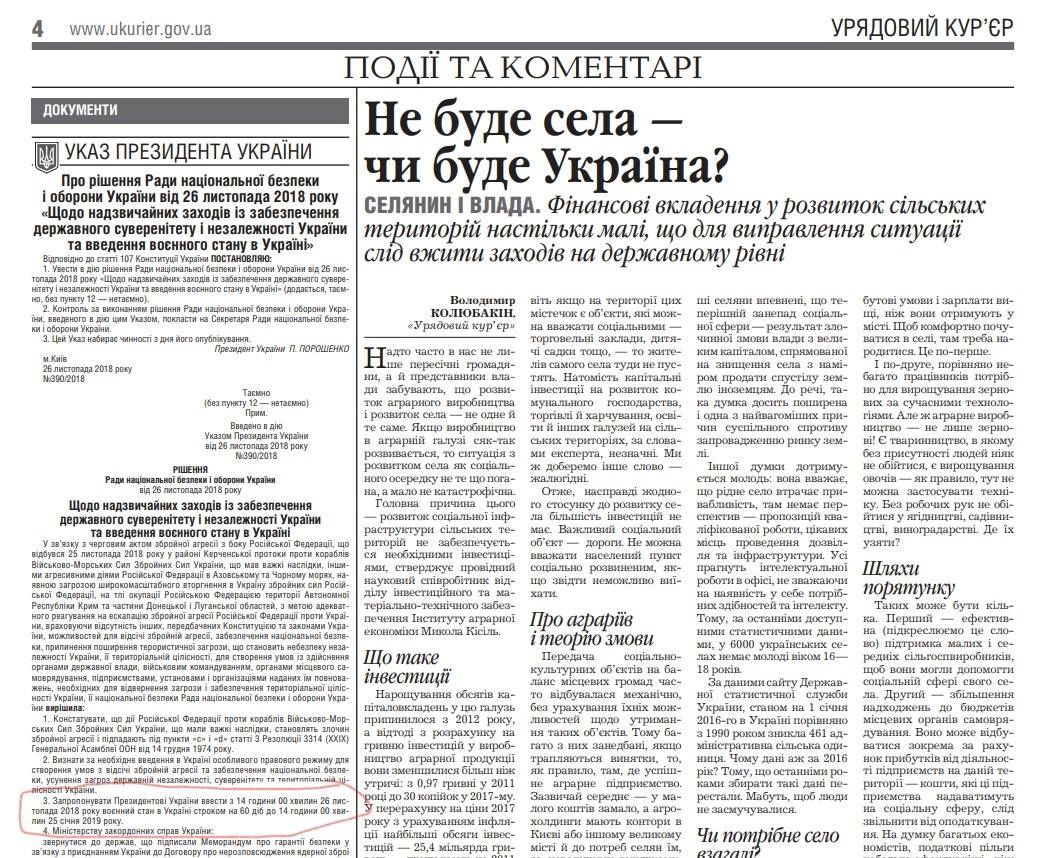 «Урядовий кур'єр» помилково опублікував указ Порошенка про воєнний стан на 60 днів
