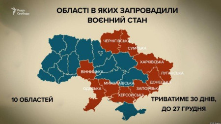 Нагадаємо, 26 листопада Рада проголосувала саме за змінений указ — воєнний стан ввели не з 28 листопада, як пропонував Порошенко, а з 26 листопада, не на 60, а на 30 днів, і не по всій Україні, а у Вінницькій, Донецькій, Запорізькій, Луганській, Сумській, Чернігівській, Харківській, Херсонській, Миколаївській, Одеській областях та у внутрішніх водах.