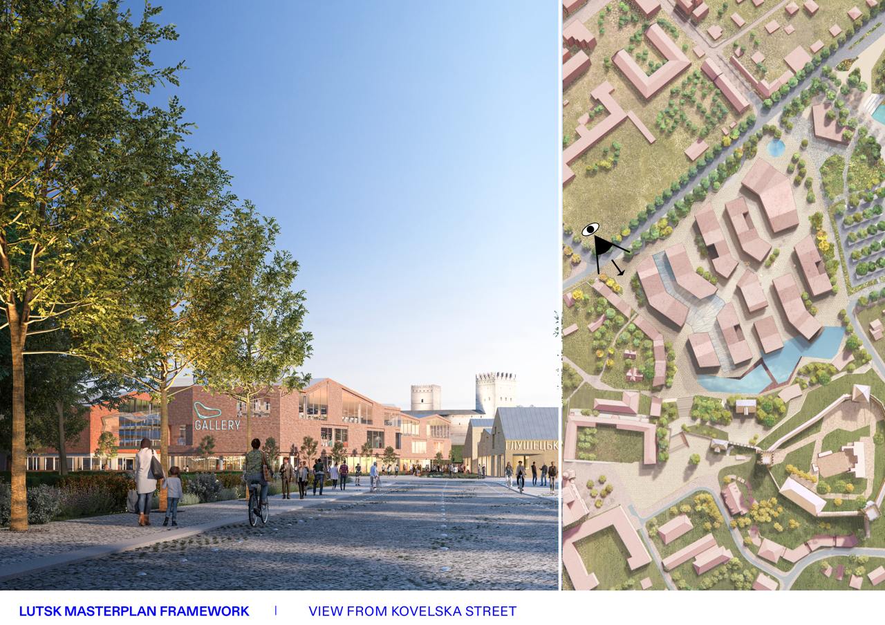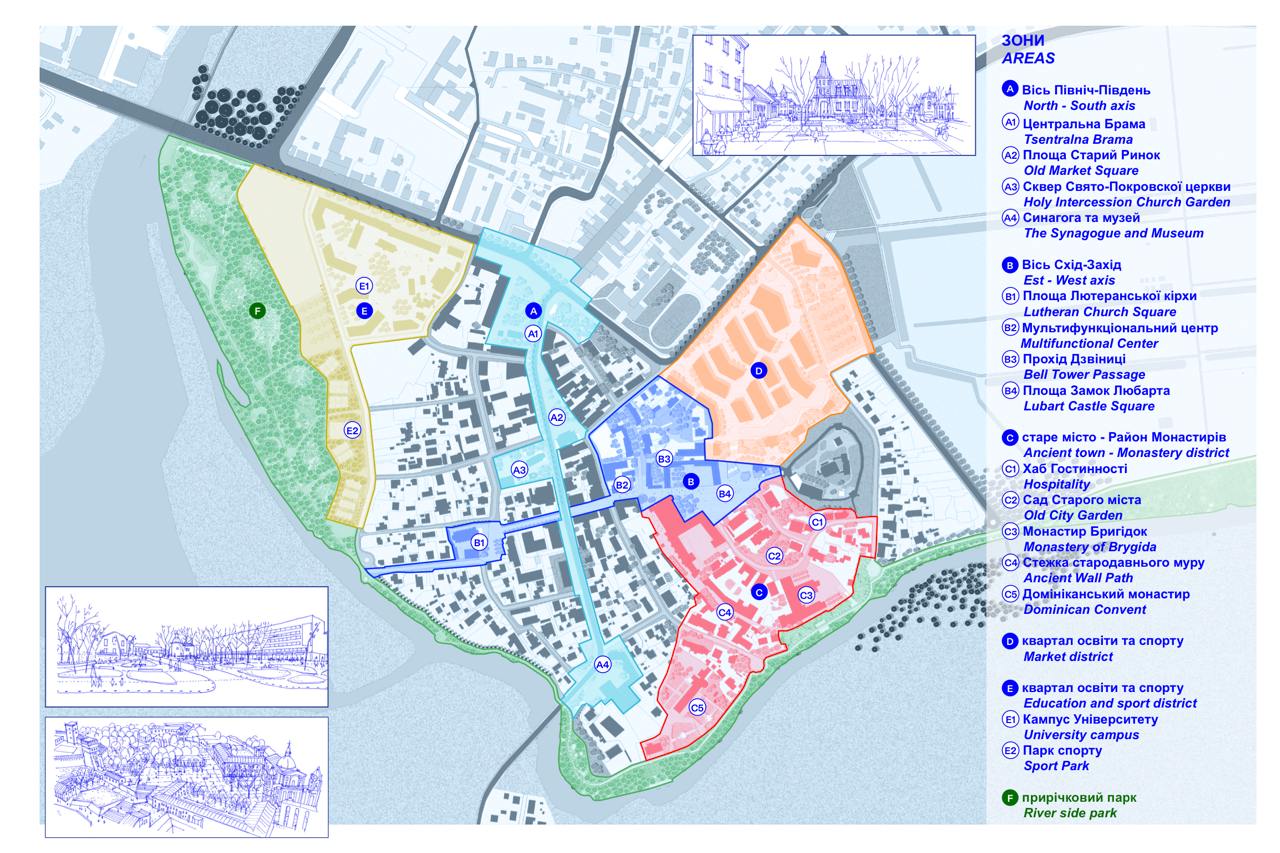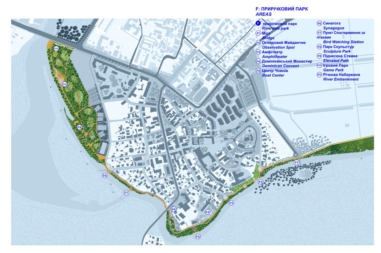 - прибережний парк.У зоні, як-от вісь північ-південь, студія Piuarch пропонує оптимізувати автомобільний рух на перехресті вулиць Ковельська і Данила Галицького, облаштувати там нові тротуари, встановити вуличні меблі, створити якісний публічний простір на площі Ринок, відкрити для всіх охочих сквер Свято-Покровської церкви та облагородити його, створити культурний хаб єврейської історії в синагозі.