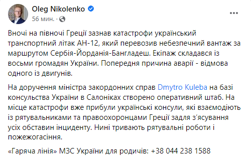 Як повідомлялось, у ніч проти 17 липня військово-транспортний літак АН-12 розбився на захід від аеропорту Кавали в громаді Пангеон на північному сході Греції. Як випливає з даних сервісу з відстеження переміщень літаків Flightradar24 від 16 липня, машина виконувала рейс з аеропорту «Костянтин Великий» поблизу Ніша у Сербії до столиці Йорданії – Амману.