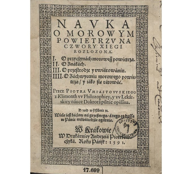 Титулка книги Петра Умястовського «Наука про морове повітря» 1591 року, частину якої написано в Луцьку