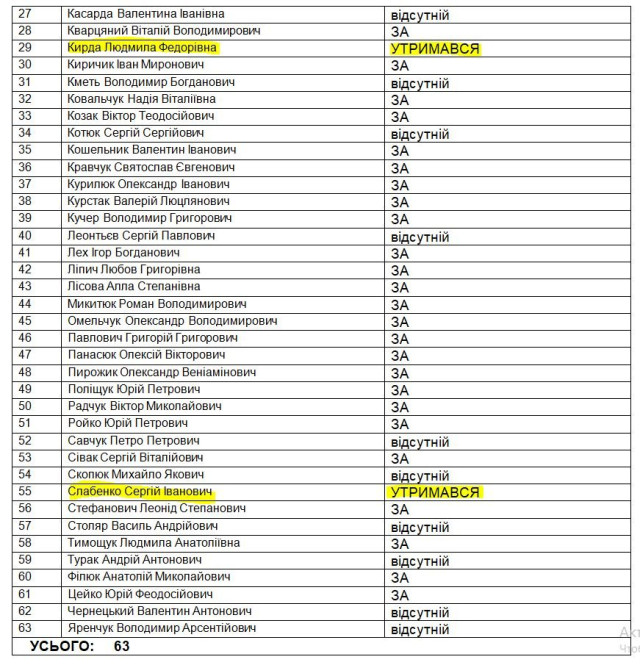 Проєкт рішення підтримали 42 депутати, проте двоє натиснули кнопку «утримався»: Сергій Слабенко (виборчий округ №48) та Людмила Кирда (виборчий округ №29).